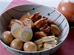 - 3鍋に砂糖を加えて落としぶたをし、さらに10~15分煮、1/2量のしょうゆを加えてさらに落としぶたをして10~15分煮る。残りのしょうゆ、ゆで卵、ねぎを加えてさらに10分煮る。途中、肉やゆで卵の上下を返しながら煮て、味をまんべんなくいきわたらせる。 時間60分、熱量995kcal、塩分3.1g(1人分)