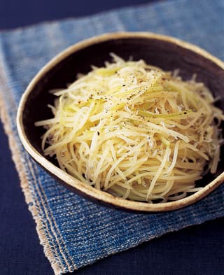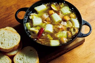 - 2鍋にたっぷりの湯を沸かして、豚肉とねぎの青い部分を入れ、煮立ったら弱火にして、10~15分ゆでる。鍋の湯とねぎの青い部分を捨てて、豚肉を戻し入れ、にんにくと酒、酢、ひたひたの水を加えて強火にかける。煮立ったら弱火にし、落としぶた(アルミホイルを鍋の大きさに合わせて切ったものでも)をして10~15分煮る。
